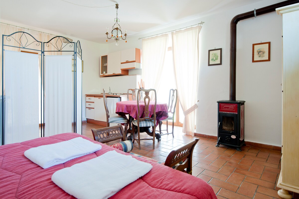La camera da letto è comoda e molto luminosa grazie alla finestra e al Velux che si apre nel soffitto spiovente con travi a vista. Il bagno, composto da doccia, lavabo, wc e bidet, è interno alla camera. C'è una piccola cucina. Ci sono i condizionatori inverter sia in camera che in cucina. Agli ospiti di questa camera è riservato uno spazio privato esterno, una piccola terrazza detta "Place Mignone" dove ci sono un tavolo e delle sedie per pranzare fuori. Da qui si accede alla piscina in comune.