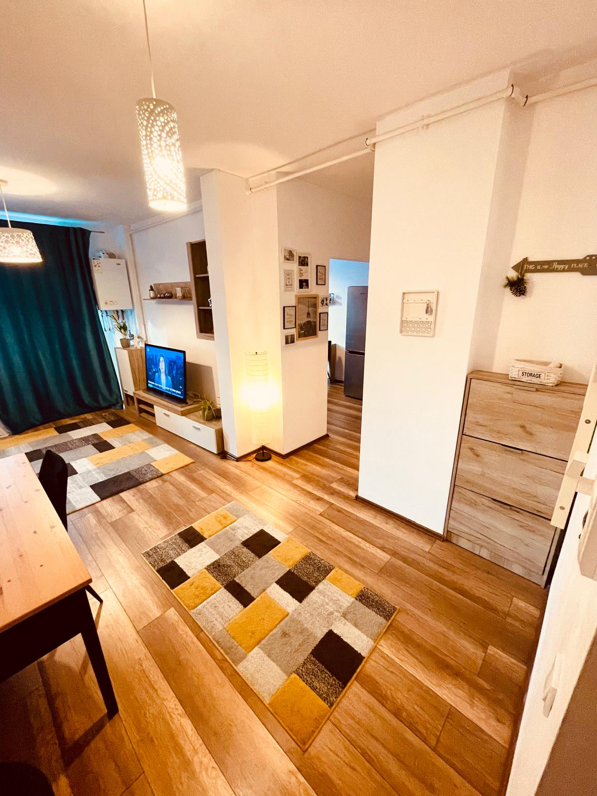 Welcome! Our modern apartment, located 5 minutes from the M26 and M21 bus stations, offers comfort and elegance in a quiet area. The M26 bus connects directly to the Central Park and the Sports Hall in Cluj-Napoca, the host of the Untold festival. Equipped with new appliances, fast internet and smart blinds, it is perfect for families. Close to pizzeria, café with playground, pharmacy, confectionery, 24/7 supermarket, fast food and fitness rooms.
