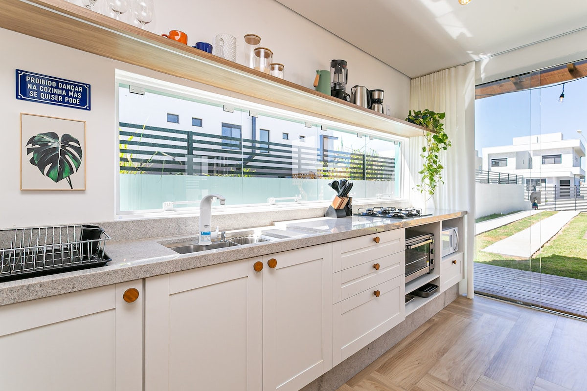 Welcome to Casa Mar, where you will enjoy a charming, very complete and well-equipped container house, all air-conditioned and very well decorated, bedroom with queen bed, workspace, great Wifi internet. Perfect place for couples and small families, or anyone looking for a comfortable getaway near the sea. Located in the Jardim Campeche subdivision, in front of the Lomba do Sabão peak, a famous spot on Campeche beach. The house is 600 meters from the sea, with easy access on foot.