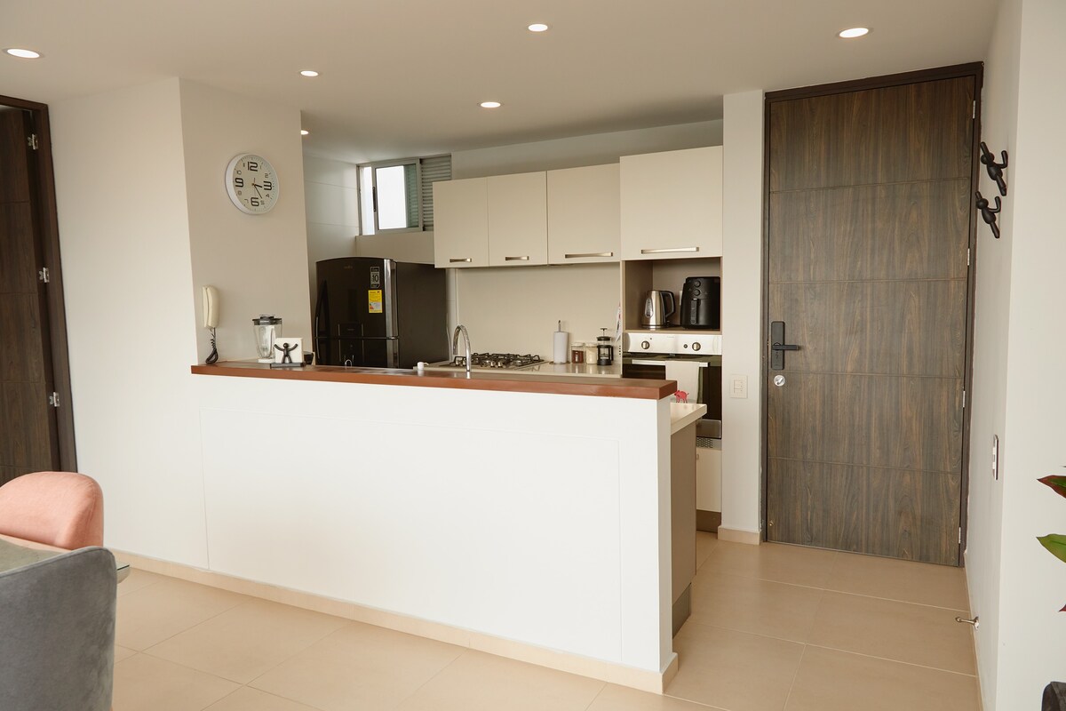 Brand new apartment overlooking Ruitoque with all amenities: - Air conditioning for the entire apartment - High-end extra double Queen mattress, 5-star Premium Hotel type. - View of Ruitoque Located 3 minutes from the Main Park, 1 minute from the "Papi Quiero Piña" bridge, 10 minutes from HIC, Foscal Quiet and safe area. Equipped kitchen, high-speed WiFi, 24/7 security. Perfect for those seeking tranquility and style in a strategic area close to everything!