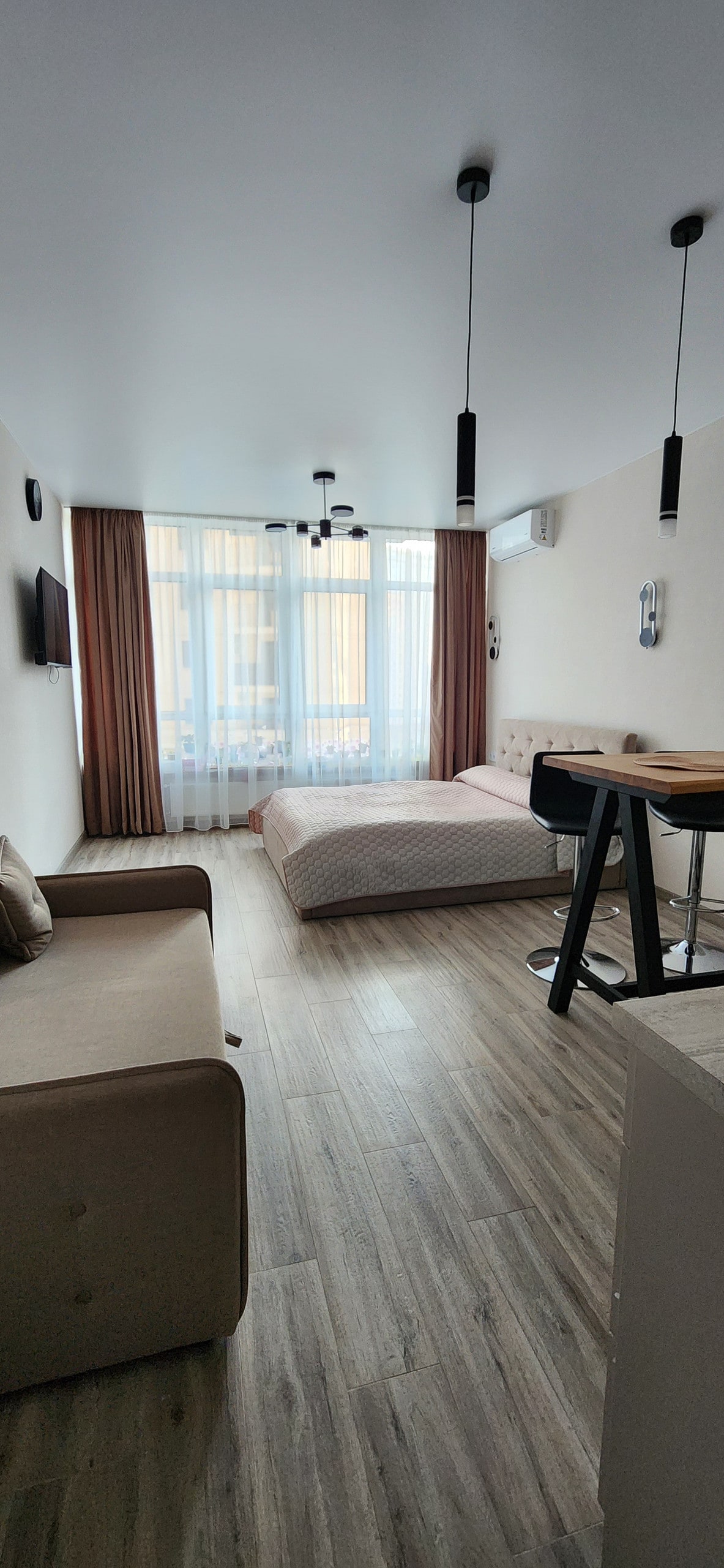 A stylish City Loft apartment in the elite Elegia Park residential complex in Arcadia. This unique home has its own unique style. A dark loft with a stylish designer interior and atmospheric lighting. A kitchen-studio with a kitchen island, a seating area, panoramic windows and wooden blinds. A separate bedroom with a king size bed and designer furniture. The apartment has new furniture and appliances.