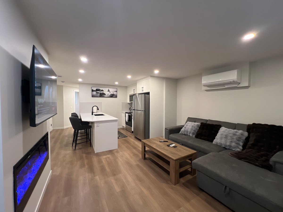 Beautiful one bedroom private basement apartment with separate entrance, spacious and centrally located. 5mins walk to shopping malls and parks and 1minute walk to bus stop. Private apartment with all modern amenities; Sit/stand workspace, modern kitchen appliances Spacious living room, Dining section and kitchen, standard refrigerator with water/ice dispenser, private laundry room. Unlimited high speed wifi, Telus, Netflix, Amazon/Disney+ on new Smart TV. Welcome water/Coffee/tea and cream.