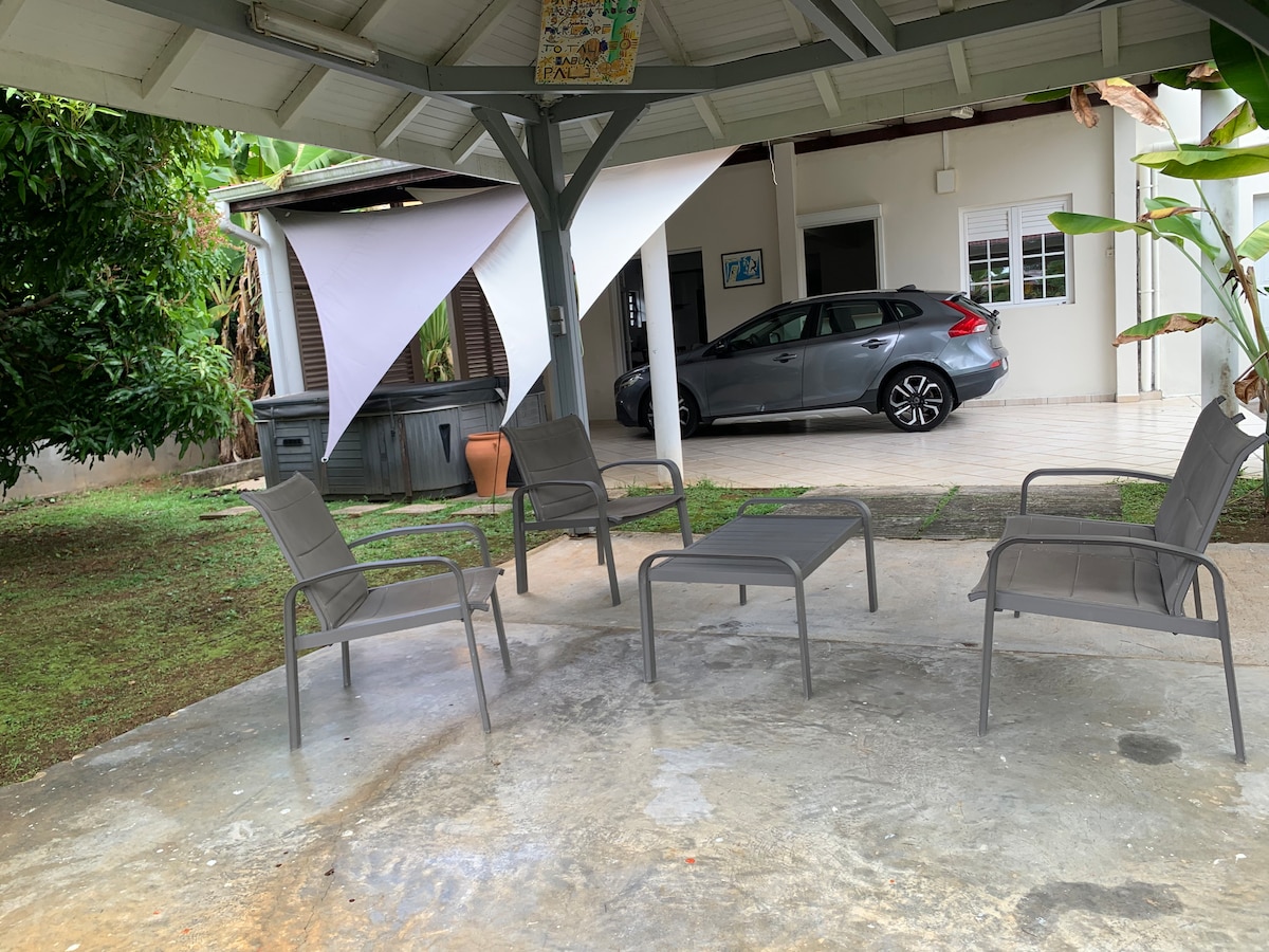 In a spacious and serene space, you can enjoy the calm in the hammocks while listening to the songs of birds, seeing butterflies and a little reading in the outdoor lounge. You can cook good dishes in a pleasant kitchen. Large bedroom with a double bed and fan. By car, 4 minutes from the Tivoli Fitness Trail, 15 minutes from Fort-de-France city center, Jardin de Balata and Absalon, 20 minutes from the airport and 17 minutes from Madiana Beach.