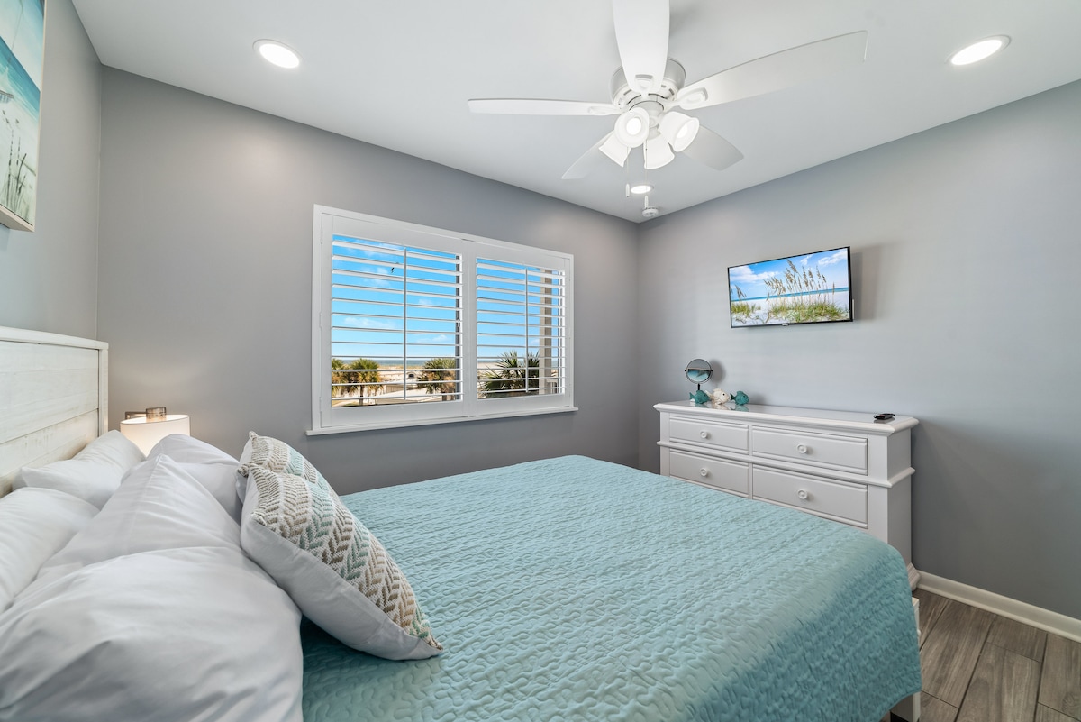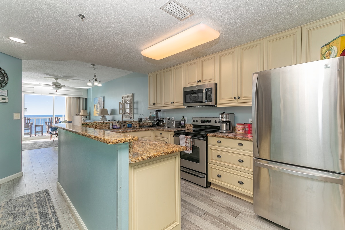 Experience the ultimate escape in this top-floor, direct beachfront 1-BR/1-BA condo at GSP The Resort (Bldg 2) in Ft. Morgan. Take in breathtaking sunrises and sunsets from your private balcony! Step inside to a fun beach vibe with modern updates, including "weathered-wood" tile floors, a custom tiled walk-in shower, and a stylish vessel sink. The L-shaped kitchen offers extra counter space and storage for easy meal prep. We aim to provide a 5-star experience for your perfect beach getaway!