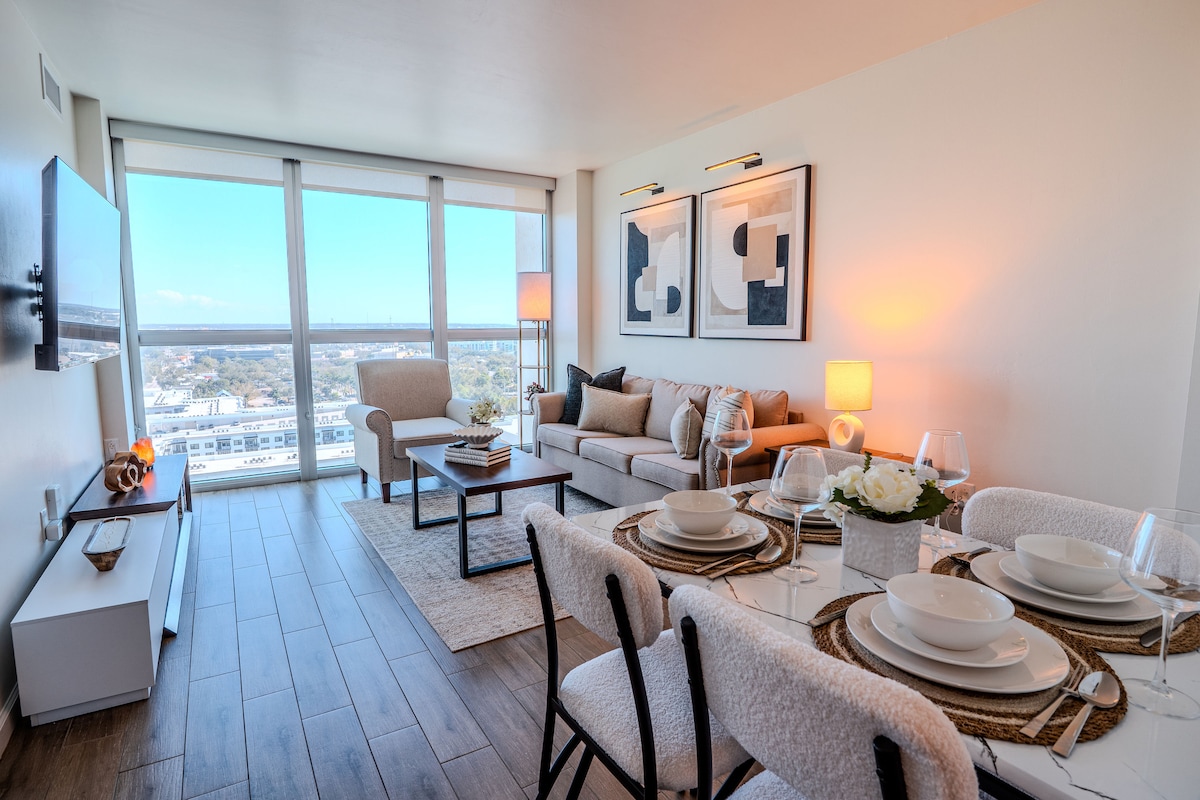 Welcome to Level 19, a modern 19th-floor retreat in Downtown Fort Myers. Enjoy beautiful skyline views, warm décor, and a fully equipped kitchen. Relax in the living area with Queen sofa bed and unwind at the pool, hot tub, or gym. Designed for comfort, this King suite hosts up to four guests. City Views | Pool | Hot Tub | Gym | King Bed | Queen Sofa Bed | Wi-Fi | Smart TV Dining: 2–5 min walk | Edison & Ford 5–10 min | Fort Myers Beach 25–30 min | RSW 25 min