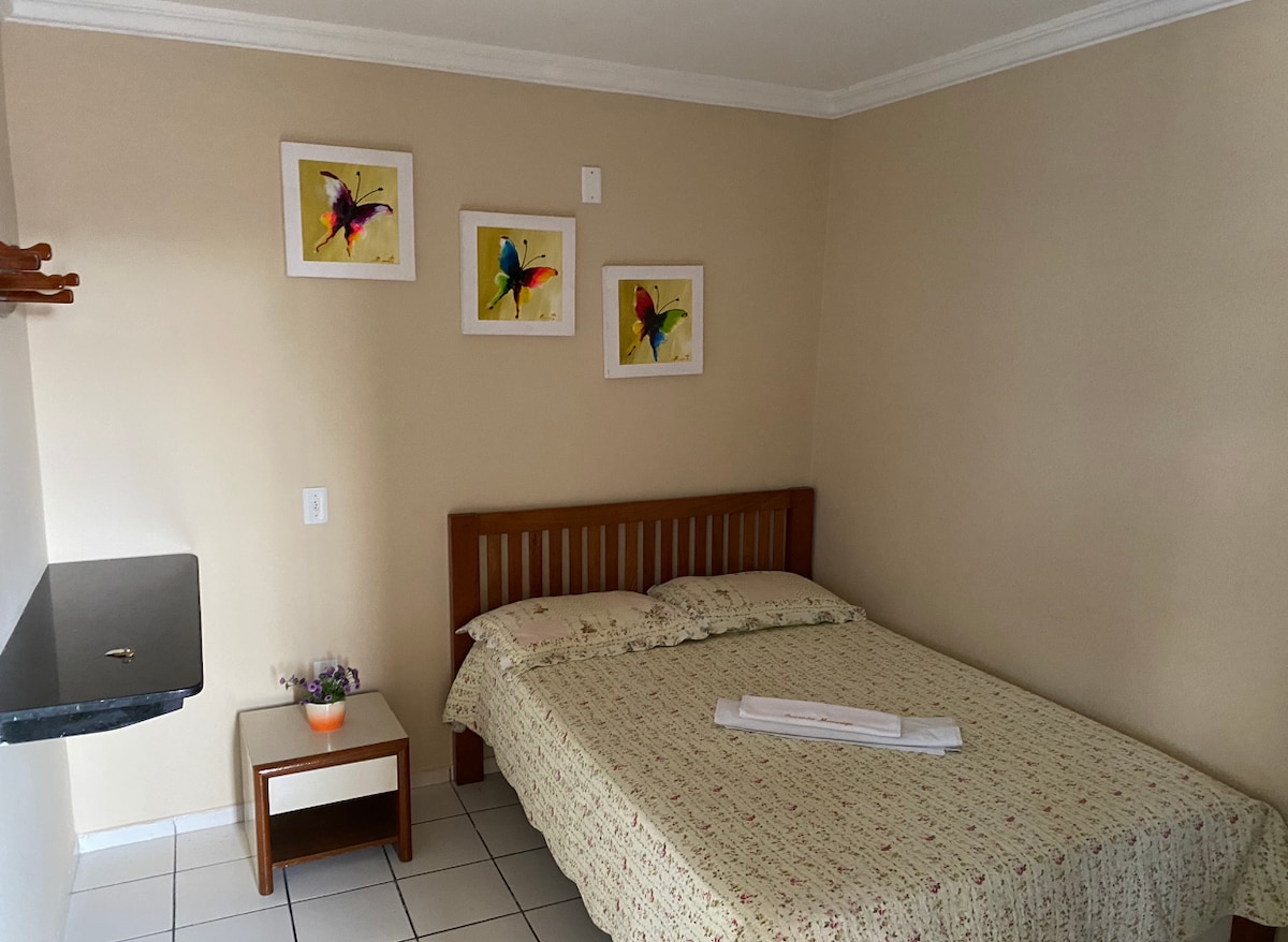 Apartamentos para casal com ar-condicionado, frigobar e televisão.