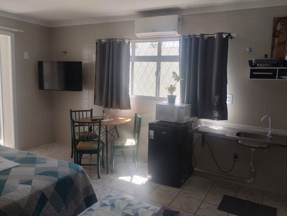Your family will be close to everything when you stay at this cozy, safe and centrally-located place. Studio in the center of Foz do Iguaçu, close to the main tourist attractions, bakeries, shopping, supermarket, shopping center and restaurants. Room for up to 7 people with: - 2 full beds - 1 sofa bed - 1 extra mattress - Table and stools - WiFi - TV with Chrome Cast - Air-conditioning - Private bathroom Kitchen with: sink, refrigerator, cooktop, microwave and dishes. Free parking