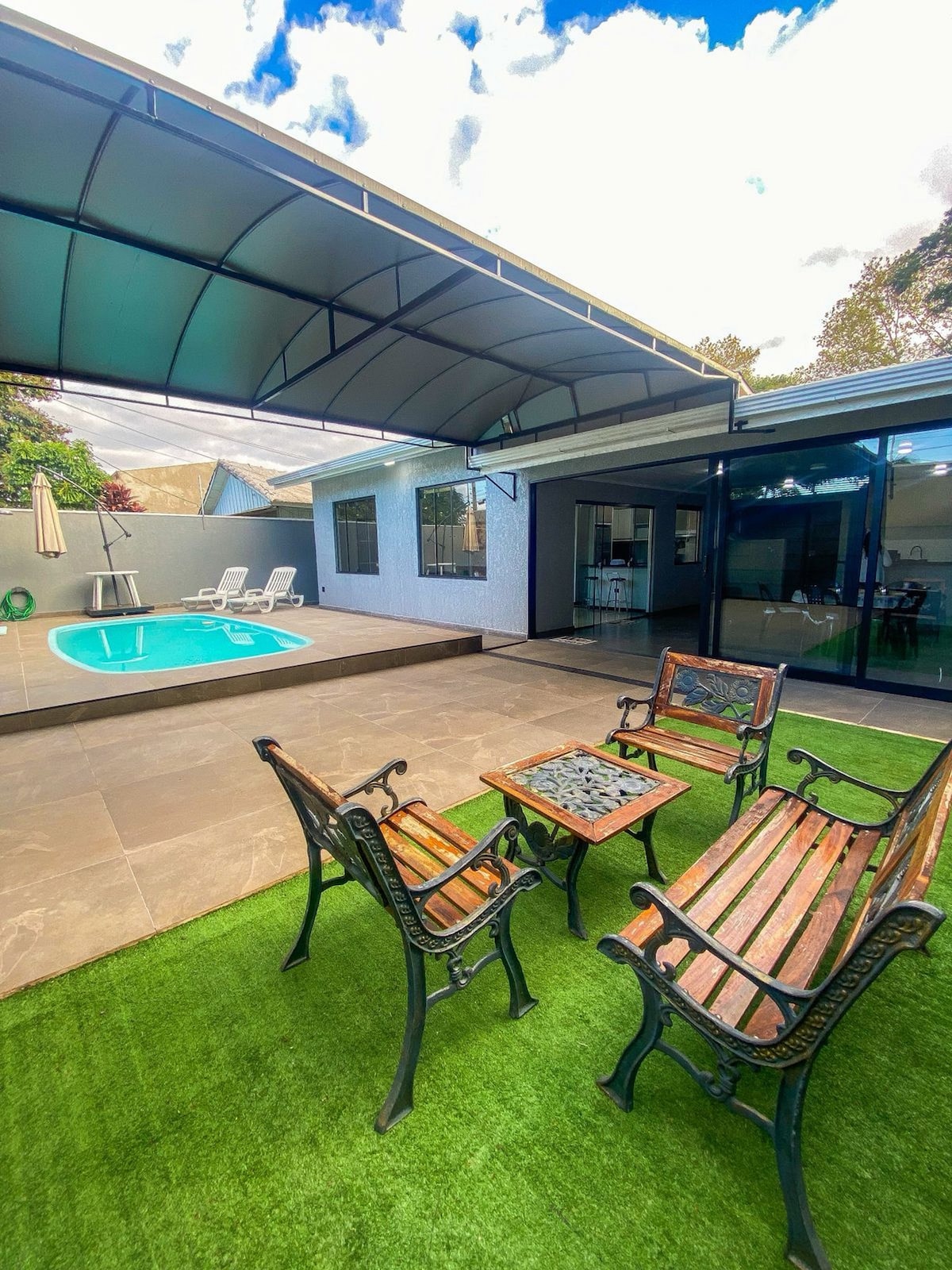 Bring the whole family to this great place with lots of room for your moment of rest and leisure. Environment with 4 en-suites and 1 external bathroom, 4 en-suites with air-conditioning, living room, dining room, gazebo with barbecue, sink, swimming pool, full kitchen including refrigerator, microwave, electric oven, blender, sandwich maker and necessary utensils. Covered garage for 2 cars and open space for 3 more. NOTE: the pool does not have a heater