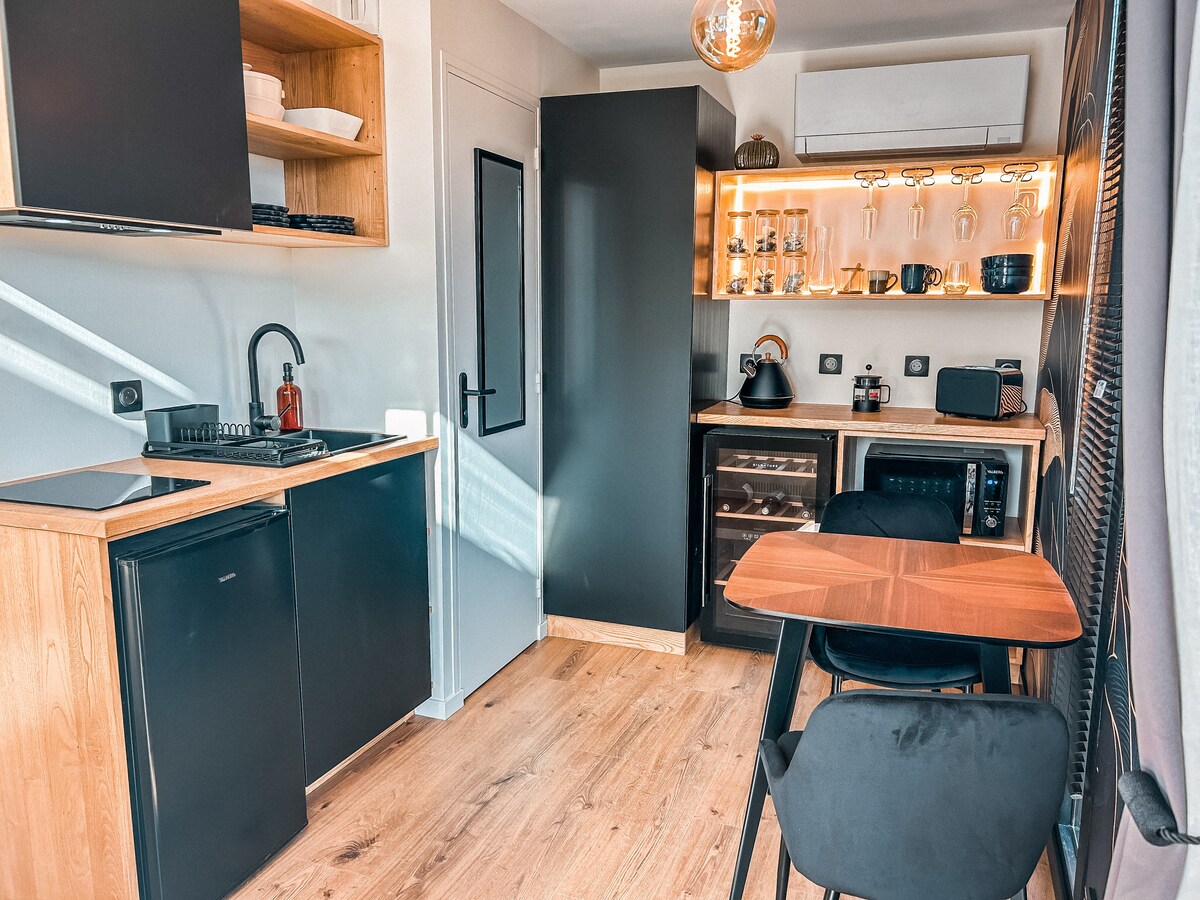 this small house set on the hillside is like a secret place with a wonderful view of the completely independent lake, built at the entrance of the property, it is not overlooked, with high-end comfort, a large 70 m2 terrace with a private spa, under shelter, with lake views. This house is only for 2 adults, no children (no additional person is possible).
