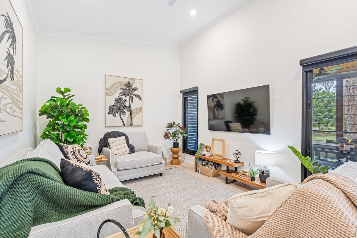 An impeccably curated luxury bungalow featuring high‑end furnishings, a king bedroom, a twin king‑single room that converts to a second king, a state‑of‑the‑art bathroom, modern kitchen and spacious lounge with a queen sofa bed (sleeps 6). Enjoy lush greenery, premium amenities and a breezy private verandah with BBQ. A peaceful, luxe escape among nature, just 5 minutes to beaches and shops, perfect for families and professionals.