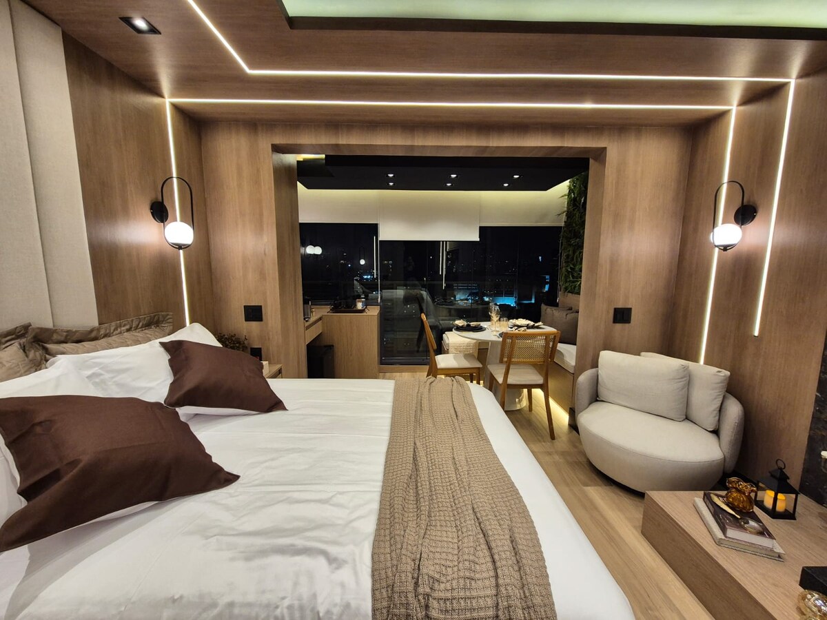 Transport yourself to the Island of Java, and enjoy a unique experience in this magical and very well-located place. Unique view of the Anhangabaú Valley. Queen bed, hydro with chromotherapy, unique decor, equipped kitchen, bathroom with super shower, Alexa, fast internet, linens and towel sets available with a hammock facing the window. Also, enjoy an amazing fireplace made of volcanic stones. Surreal, isn't it? Enjoy! Best wishes