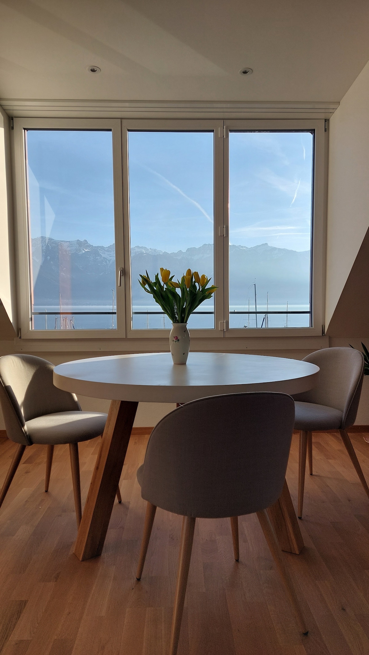 This wonderful, new loft is located near Vevey on Lake Geneva. It offers wonderful views of the lake and the Unesco World Heritage Site of Lavaux with its picturesque vineyards. The loft's stylish bathroom, kitchen and living area, along with the amazing views, will make you want to stay forever. You have access to the beautiful garden. Parking is available and those arriving by electric vehicle can charge. Various water sports equipment and bicycles are also available.