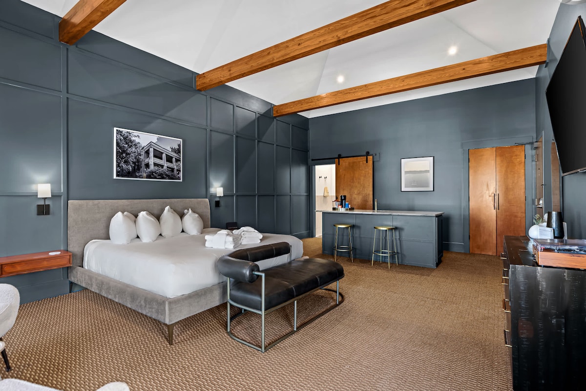 Our Superior King Suite is the largest and most spacious accommodation on the property. Located on the second floor, this stunning suite features dramatic 14-foot beamed ceilings, a plush king-size bed, an island wet bar, and a private balcony, perfect for enjoying a quiet moment in Beaufort. The spacious spa-style bathroom includes a luxurious dual-head rain shower for the ultimate relaxing experience.
