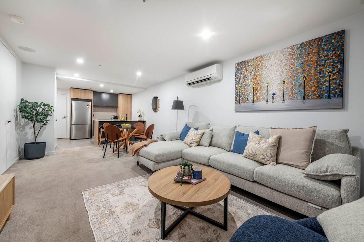 Enjoy easy city living. Free wifi Complimentary wine 🍷 on arrival Coffee machine with pods supplied Washing machine and dryer King bed Queen sofa bed Gym on-site Cafes and bus interchange at your door step Westfield straight across the road Free Secure parking Apartment located on the 7th floor 55 inch Smart TV Large floor to ceiling windows so the kids can watch buses 🚌 come and go till their hearts content.