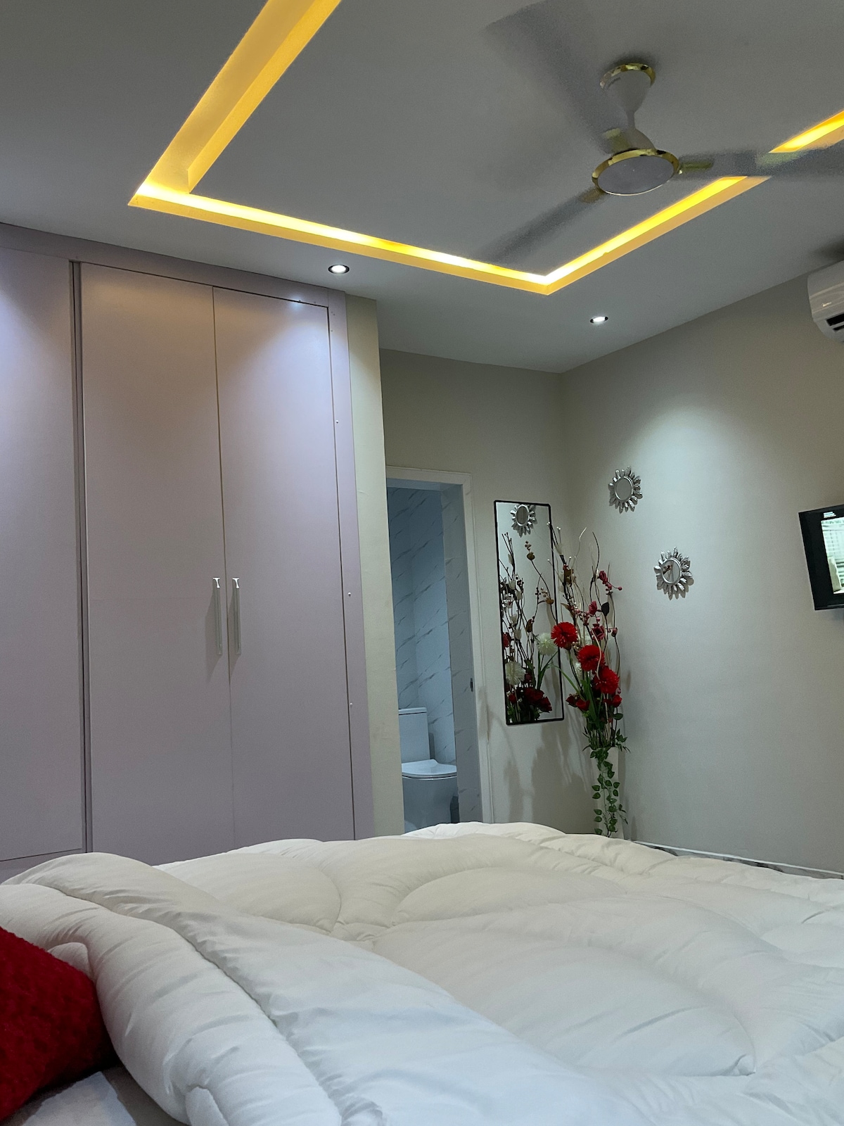 Luxurious, newly built, spacious one bedroom ensuite apartment for short & long term rent. The house is located in a prime part of North legon. 9.5km from Kotoka international Airport and 1.5km away from University of Ghana, Atlantic Mall, Palace Mall, Legon botanical garden, the apartment is close to everywhere. The ensuite room comes with a queen size bed, orthopaedic mattress & pillows for sound sleep. The smart apartment comes with a cctv cameras, ideal for comfort and safety living.