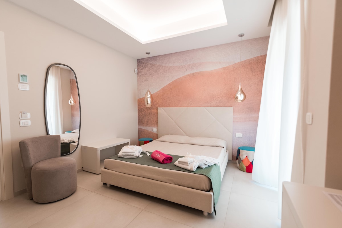 The "Nova Families" are equipped with two large communicating rooms; one is double and the other can be set double or single. Here the privilege is the silence; the pleasure is given by the absolute tranquility and the possibility of immersing oneself in the colors of the countryside and the structure's garden. With generous spaces, they are tastefully furnished and equipped with every comfort including a large furnished terrace where you can enjoy the sea view by day and the stars by night.