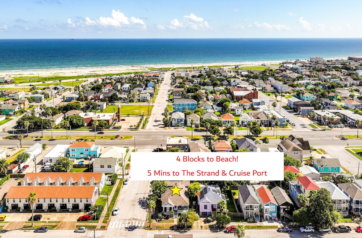 Prime Location! Beautifully renovated and thoughtfully designed beach retreat, blending modern luxury with extra amenities. Walk to the famous Strand for dining, shopping, art, and nightlife. Just steps from Stewart & Porretto beaches, cruises, and UTMB. Minutes by car to Pleasure Pier, Moody Gardens, Schlitterbahn, and the Seawall. Historic charm meets comfort with 2 bedrooms, 2 bathrooms and a queen sofa bed. King bed in the primary suite! Ideal for families, couples, or solo adventurers!