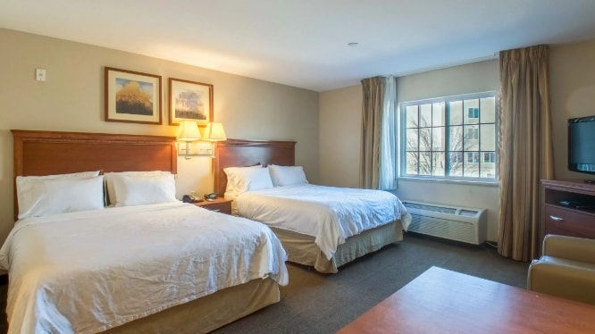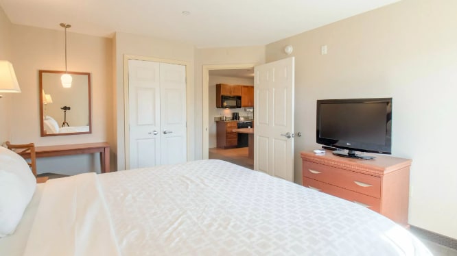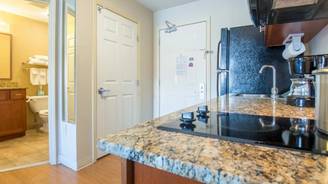 The Queen Studio – ADA hearing accessible rooms include hearing access, as well as all of the convenient amenities that our valued guests need to ensure you have a comfortable stay. There is a plush queen bed, as well as extra seating, HD TV, and a work desk. The room also features a fully equipped kitchen with everything you need, including a fridge oven, microwave, all utensils, a dishwasher and a stove top. The clean and modern private bathroom comes with a tub.