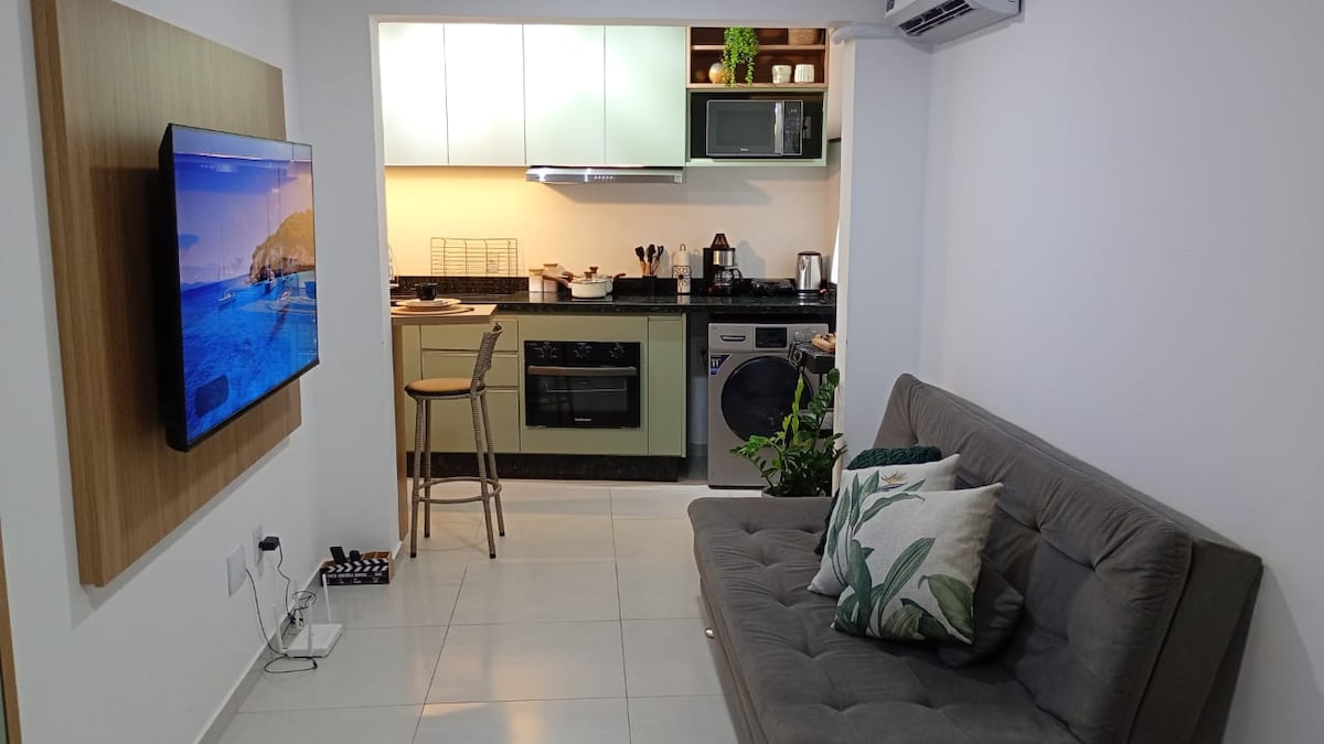 Large, comfortable, spacious, cozy, practical, private and safe studio. Designed to receive a young couple, in good spirits, nature and beach lovers. 5 minutes from the beach by car (2 km) 1300 meters from the center. - Queen-size box bed (large and delightful) -32-inch Smart TV -Stable 100mb fiber Wi-Fi -Full and functional kitchen - Giant, private balcony to relax in the hammock and enjoy the sunset - Large bathroom, glass shower, granite sink, delicious bath - Air-conditioning, Heating and Cooling :)