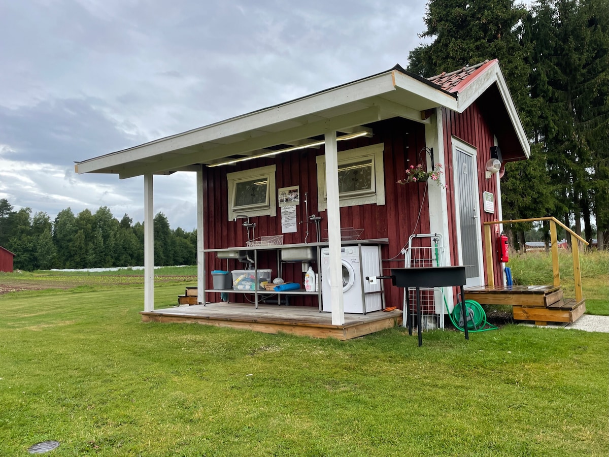 Rum med pentry, 25 kvadratmeter. Badrum med dusch. En dubbelsäng (120 cm bred) samt bäddsoffa för 2 personer. Boendet är maximerat för 2 vuxna, men finns även plats för 2 små barn. Pentry utrustad med spishäll, kylskåp, mikrovågsugn, vattenkokare, kaffebryggare. TV och Wifi. Handdukar och sängkläder ingår. Ni får även tillgång till tvättstuga som finns i huvudbyggnaden. Vi tar ut en städavgift på 200kr för sängkläder osv. Däremot räknar vi med att ni genomför en finstädning innan ni checkar ut.