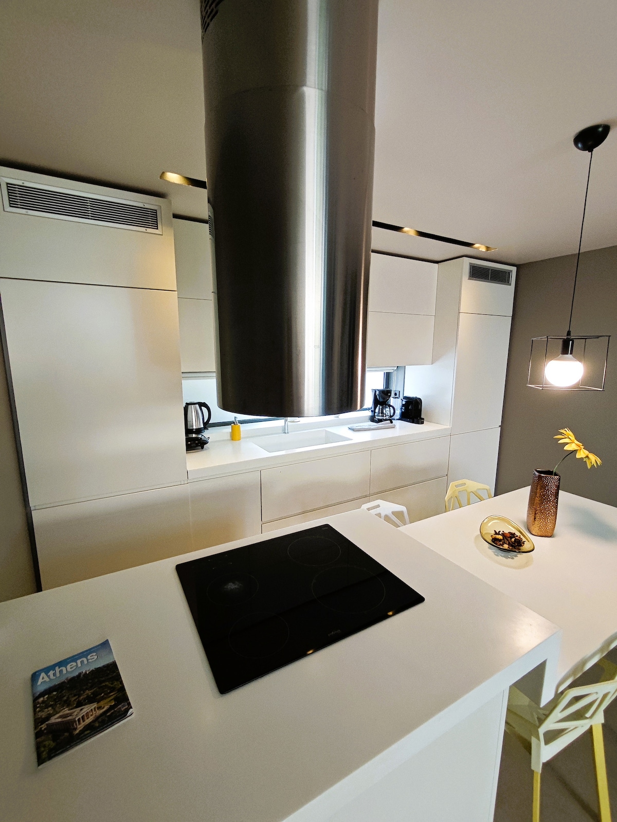 A luxury penthouse loft in the hip edge of central Athens, with breathtaking view of the Acropolis/Parthenon and the Gazi Industrial Gas Museum, spacious -same level-terrace and 360 view of the whole area. Enjoy all the different colours of the Attica's sky, the amazing sunrises and the blueish painted hills, stunning sunsets and the stars above the city lights. A hidden, quite place that offers anything a citizen of the world and/or a demanding, independent traveller may need.
