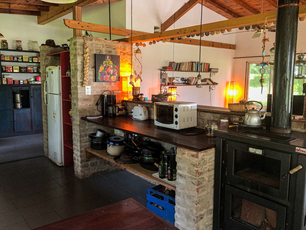 The house, surrounded by trees and birds, is part of a 44-hectare field on the edge of a stream with a lagoon. The warmth of the house, with the fireplace lit, is ideal for up to 12 people. Its spacious living room with an integrated kitchen has windows with wonderful views and magical sunsets. Its covered gallery and spacious deck invite you to enjoy readings, shared mates, meditation mornings, and the embrace of the night sky with its incandescent stars.
