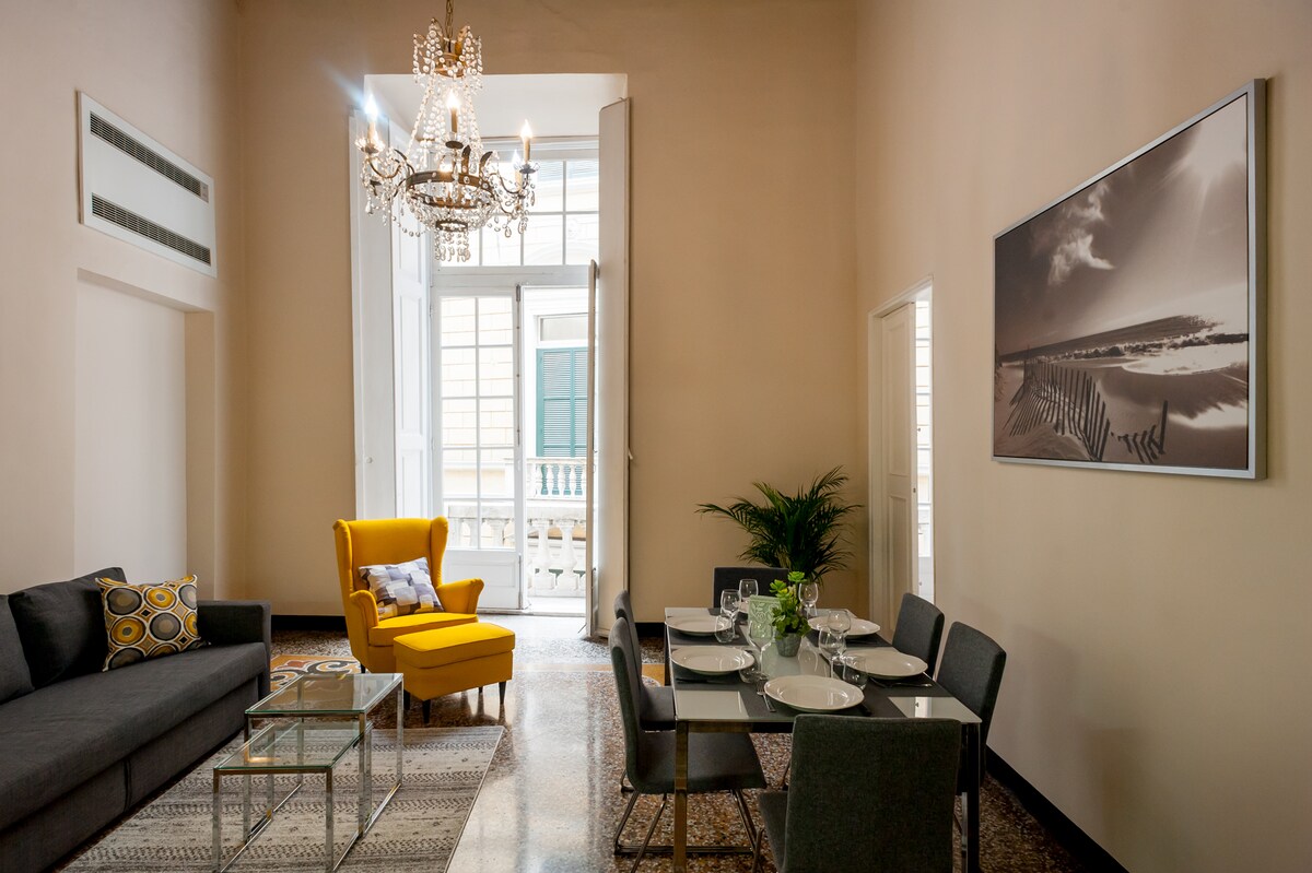 Cod.CITR: 010025-CAV-0032 Appartamento situato al piano nobile di Palazzo Cambiaso del XIII sec. Di fronte all'Acquario, in posizione strategica per visitare il centro storico. Altissime finestre con balconi in marmo, 2 camere matrimoniali con aria condizionata. Ampio living con alti soffitti ,angolo cottura, tavolo, divano letto. Forno a microonde, bollitore e macchina del caffè. Sono inclusi biancheria da letto ed asciugamani , prodotti toilette ed asciugacapelli. Tv e wi-fi gratuito.
