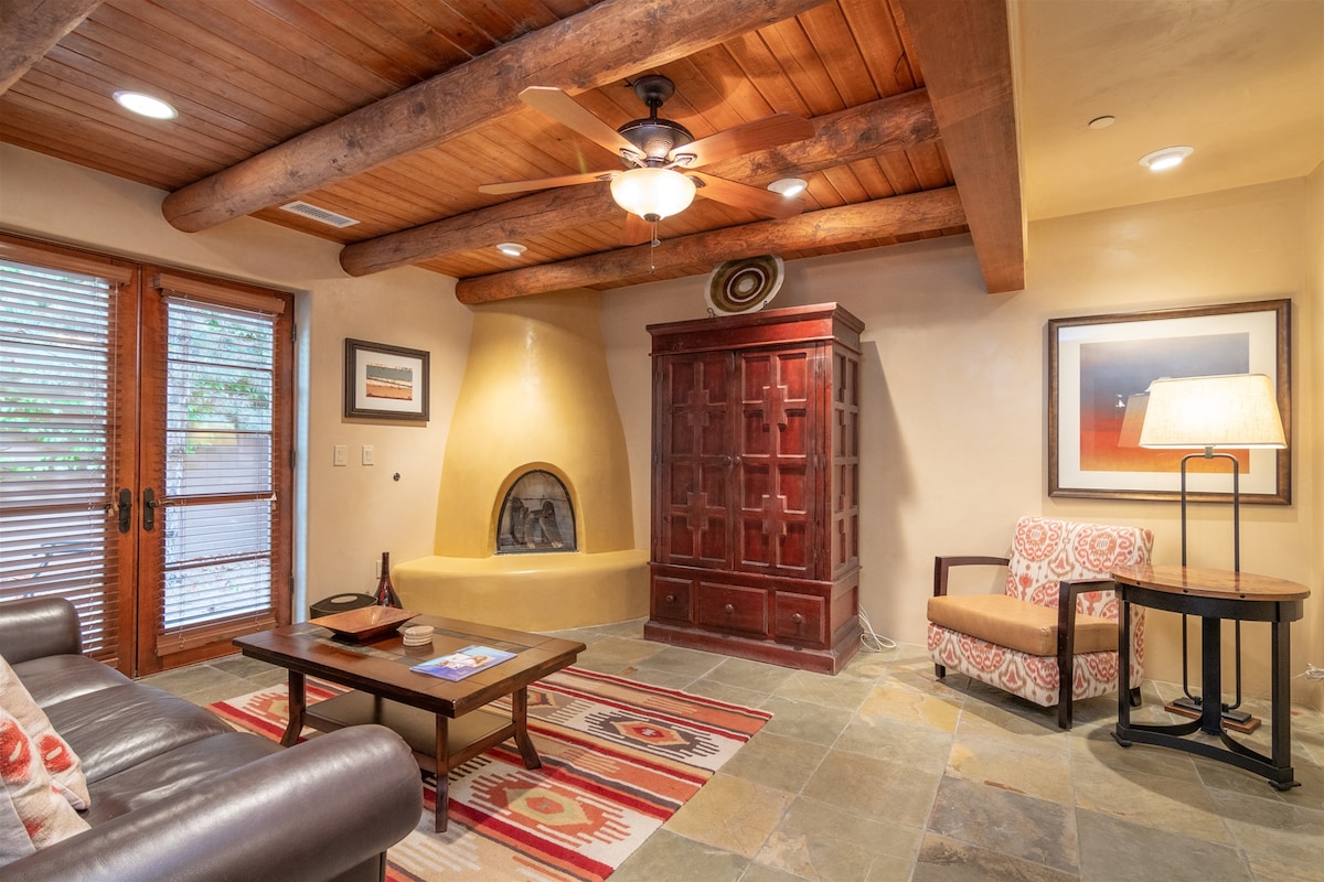 Our charming historic classic adobe casita is an easy ten minute walk to the Santa Fe Plaza, dining, and museums. We offer private off street parking for two vehicles. The interior features classic Santa Fe style wood beam Viga ceilings, kiva fireplace stocked with wood, skylights, a full kitchen living area, private bedroom, soaking tub, modern appliances, washer & dryer, swamp cooler, WIFI, flat-screen TV, a lovely enclosed courtyard with mature trees and BBQ. Dogs are welcome.