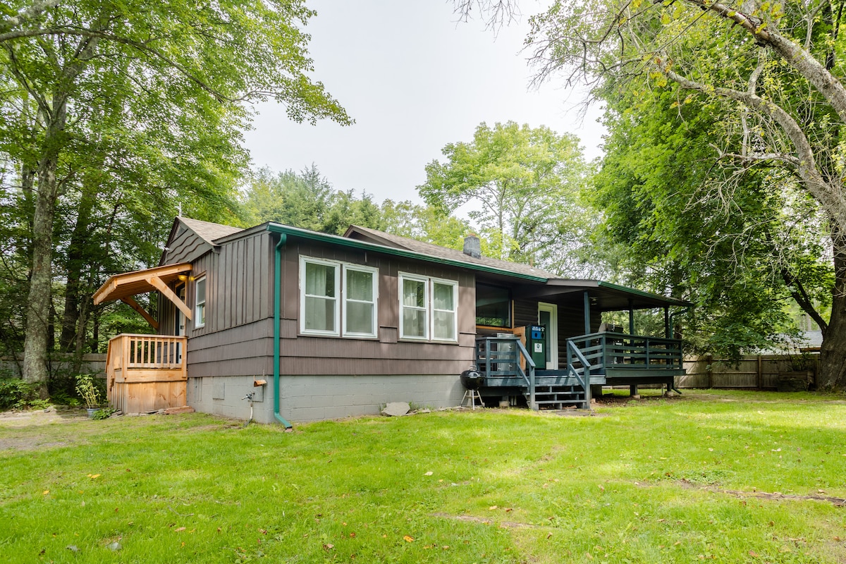 Newly renovated two bedroom, two bath cottage with four person barrel sauna at Swinging Bridge Reservoir, Sullivan County's largest motorboat lake. Updated amenities and mid-century and modern furniture provide a welcome respite from the city just 90 miles away. Take in the local scenery, catch a show at the Forestburgh Playhouse or stop into some of the local vineyards and restaurants. For a low key weekend, hang out by the fireplace playing some records and cooking a meal.