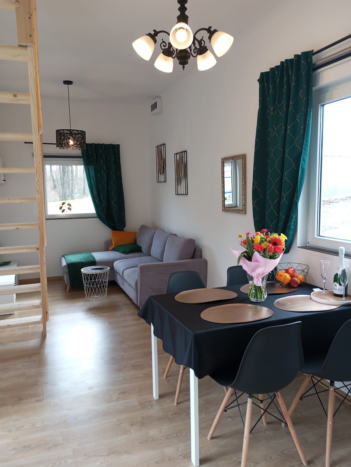 Twój dom poza domem. Mając na względzie dobrostan Gości domek został stworzony tak, aby każdy czuł się w nim dobrze. Sad oraz plantacja dają poczucie odosobnienia i nieskrępowania obecnością gospodarzy. Jest to miejsce dla osób ceniących ciszę, swobodę i komfort domowego wnętrza. Kuchnia została w pełni wyposażona, w tym w cukier, sól czy herbatę. Na dole sofa rozkładana, na górze open space - 2 łóżka kontynentalne dają wyjątkowy komfort snu zarówno parze, jak i osobom chcącym spać oddzielnie.