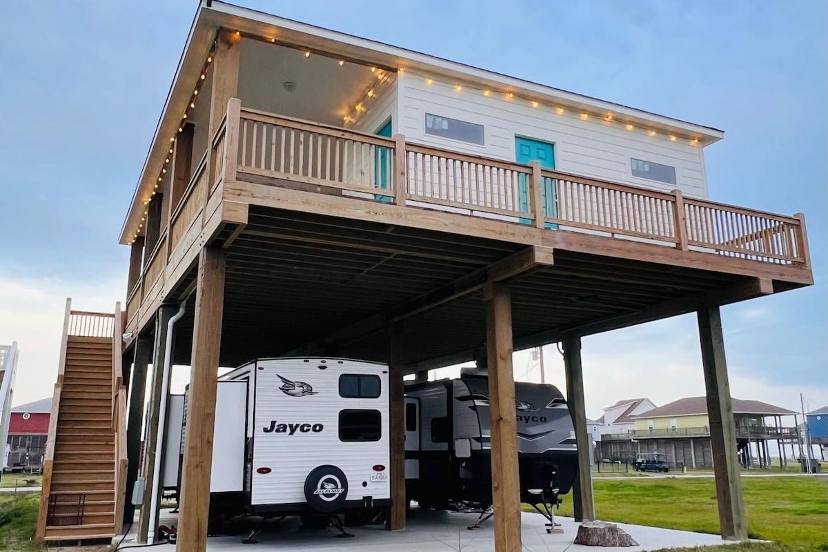 PRIVATE RV Port with 2-50/30amp full hook ups, Just a block to the beach, Upper deck for your relaxing PLUS a fully fenced yard for your pets and children. Private access to entire downstairs area and full access to upper open covered deck with fantastic views. (Open areas only) an Outdoor sand shower. Just A five minute walk, or two minute golf cart ride to the beach! Bring your own RV and enjoy the beach life! * There isn’t a bedroom available, (AIRBNB doesn’t have a 0 bedroom option)