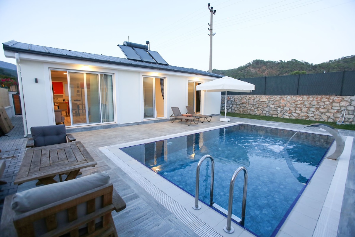 It is 2 km from the sea, the beach, 1 km from the market, 10 km from the center of Fethiye, and 25 km from Ölüdeniz. It is located in Fethiye Çiftlik area. It is a villa built in 2023, fully furnished with modern furniture, with its own pool and garden, and also a jacuzzi. It has a peaceful environment for the family, and we have a high chair and a park bed for your babies.