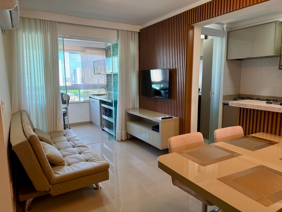 We are migrating from account, please visit: airbnb.com/h/ci7zvuek This apartment aligns modernity and comfort. All furniture with a touch of sophistication. Comfortable sofa, armchairs and king bed. With a privileged location, close to Flamboyant, the luxury condominium has a mall with amazing restaurants. Infinity pool and stunning view, gym, laundry, gourmet space, playroom, green area and more. We have an equipped kitchen.