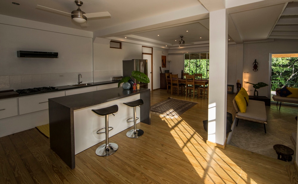 A spacious, modern, beautifully decorated home with a zen vibe and an inspiring location for working away from home. ‘Roots’ has two cozy double bedrooms, comfortable work spaces and fully-equipped kitchen with kitchen island, and deluxe double fronted fridge, en-suite bathrooms and wooden floors. Lie by the infinity pool and watch as a bright blue-grey tanager flies right over your head from one tree to the next. The perfect blend of treehouse and charming, stylish Caribbean poolside villa.
