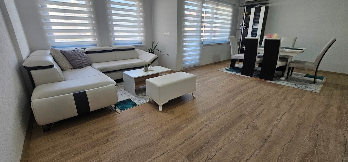 New apartment with mountain view. Welcome to a bright and fully furnished 65m² apartment just 10 minutes from the stunning Matka Canyon. -This modern unit includes a spacious living room with a sofa bed and 55" smart TV. -Kitchen with dining area. -Ideal for couples, small families, or nature-loving travelers. -Quick access to hiking, kayaking and boat tours. -12 minutes to downtown Skopje. -Safe residential neighborhood. -Free parking in garage. -Restaurants, parks, shops and bus nearby.