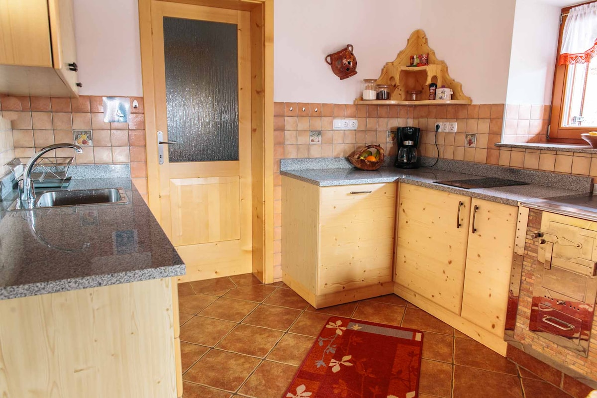 Our 2 bedroom apartment with 1 bathroom, kitchen, spacius living room with couch and dining table, A/C, and spacius patio is located just around 100 meters from Lake Bled (swimming area). It's located in very peaceful area. It has it's own entrance and is located in our house (so we're always nearby to help). We're a family of 5 and will be happy to host you. Sustainability: We produce more energy than we use. Tourism tax (3,13 for adults per day, 1,56 for children above 7) is not included.