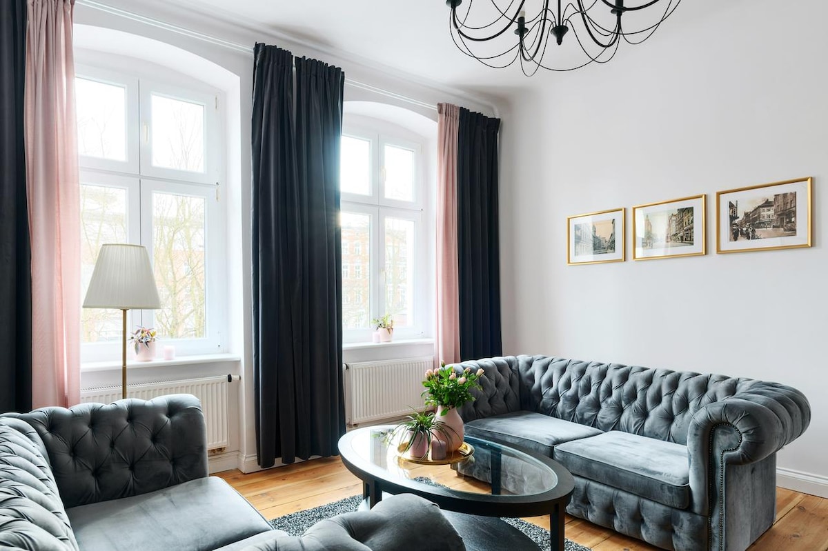 Skwer Malarzy Apartment is a comfortable Deluxe apartment with sunny rooms, an equipped kitchen and a comfortable King Size bed with a total area of 50 m2. Located on the first floor of a tenement house, in the very center of the historic district of Gorzów Wielkopolski, Nowe Miasto, on the banks of the Kłodawka River, just 100m from the Rose Park.