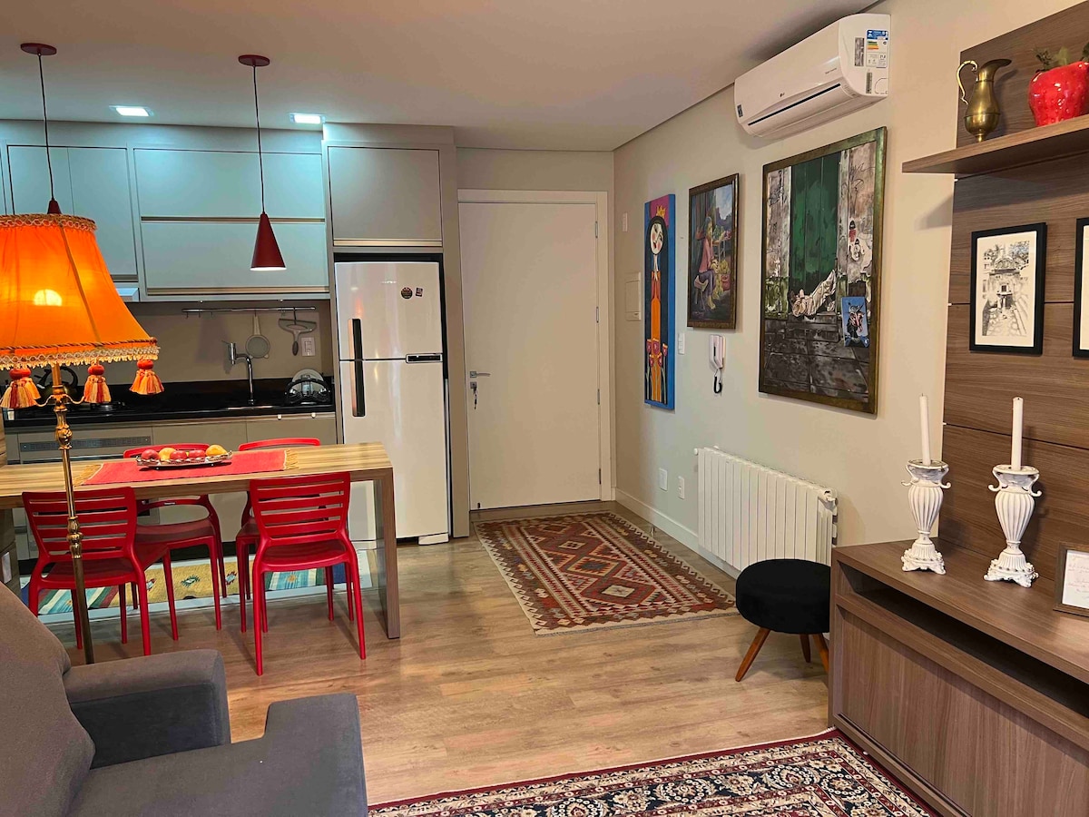 Beautiful 1-bedroom apartment - queen bed, sofa bed + a single mattress. 5 minutes from the covered street. Full kitchen with barbecue and skewers, washer and dryer, coffee maker, blender, hot and cold air conditioning, fireplace, complete trousseau; Garage for a car, not being necessary to use it to move around the city because the apartment is in the center and close to the best restaurants, supermarkets and shops. Ideal for people with special needs.