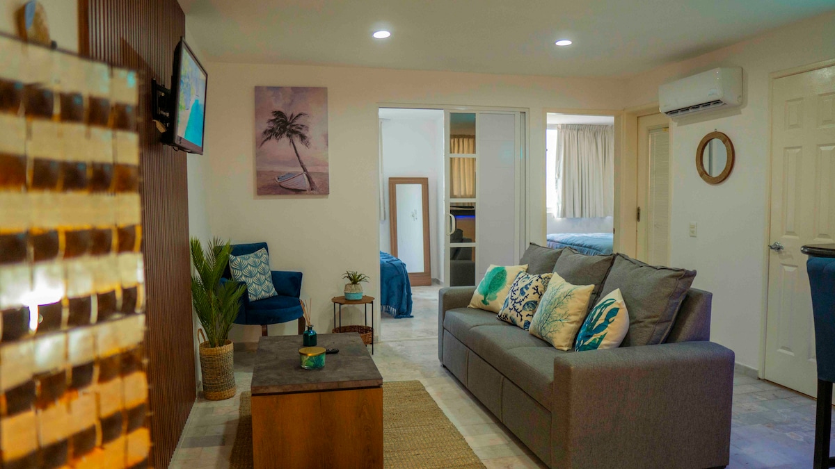 Beautiful studio just steps from the beach!! In a private complex with 24-hour security, A/C, TV, cable, and Wi-Fi. Located one block from the beach, aquarium, supermarkets and transportation. 5 minutes from the historic center and golden zone. BEAUTIFUL studio steps from beach!! Located inside a very safe gated community with 24-hour security and great amenities. A/C, TV, Wi-Fi, cable. Walking distance to the Aquarium, beach, convenience stores and transportation.