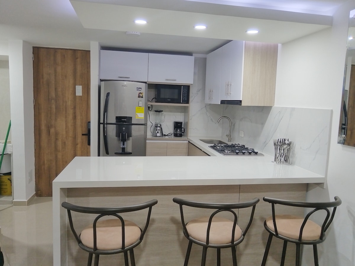 Comfortable and beautiful apartment with 2 bedrooms, each with a closet, private bathroom and AC. Main bedroom with double sofa bed (another double bed underneath) and the secondary bedroom with 2 single sofa beds (another 2 single beds underneath). Fully equipped kitchen. Living room and study with AC. High-speed Wi-Fi and cable signal. 3 Smart TVs. Building with a swimming pool and gym. Safe area. Please note that you must send your documentation prior to check-in (Colombian laws).