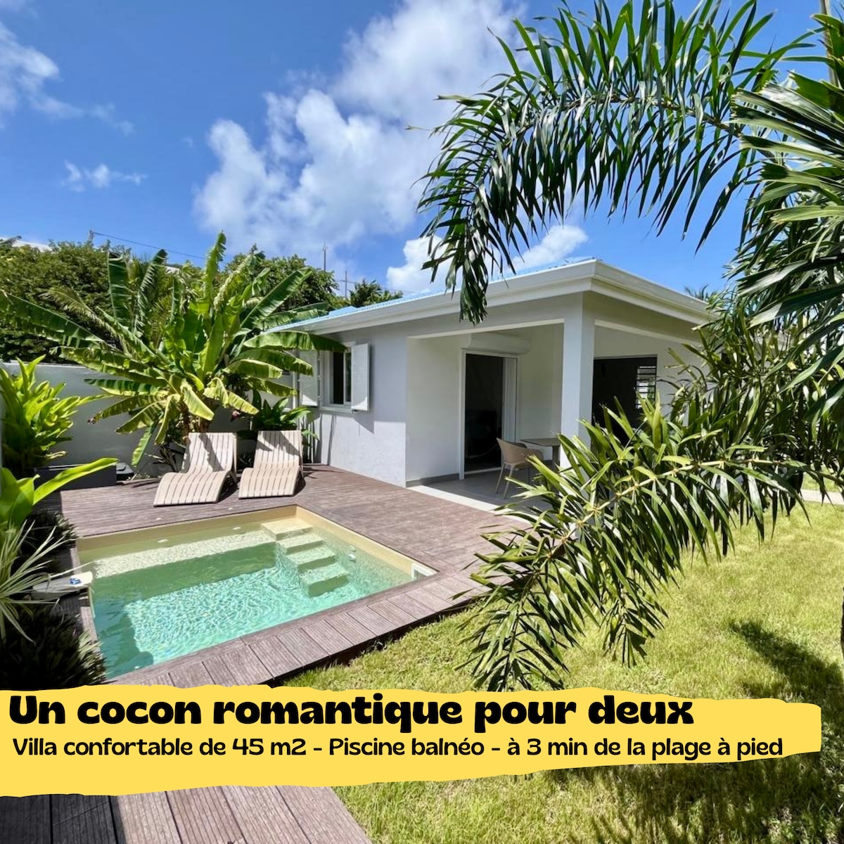 250 m walk from the beach, in a tropical atmosphere, this accommodation invites you to have a good time between visits to the island and beach and surf outings. It is equipped with: - 2 bedrooms with 140 cm bed, air-conditioned and equipped with air mixers, - equipped kitchen, - washing machine, - bathroom, - Private pool, - water tank to avoid untimely cuts, - enclosed parking.