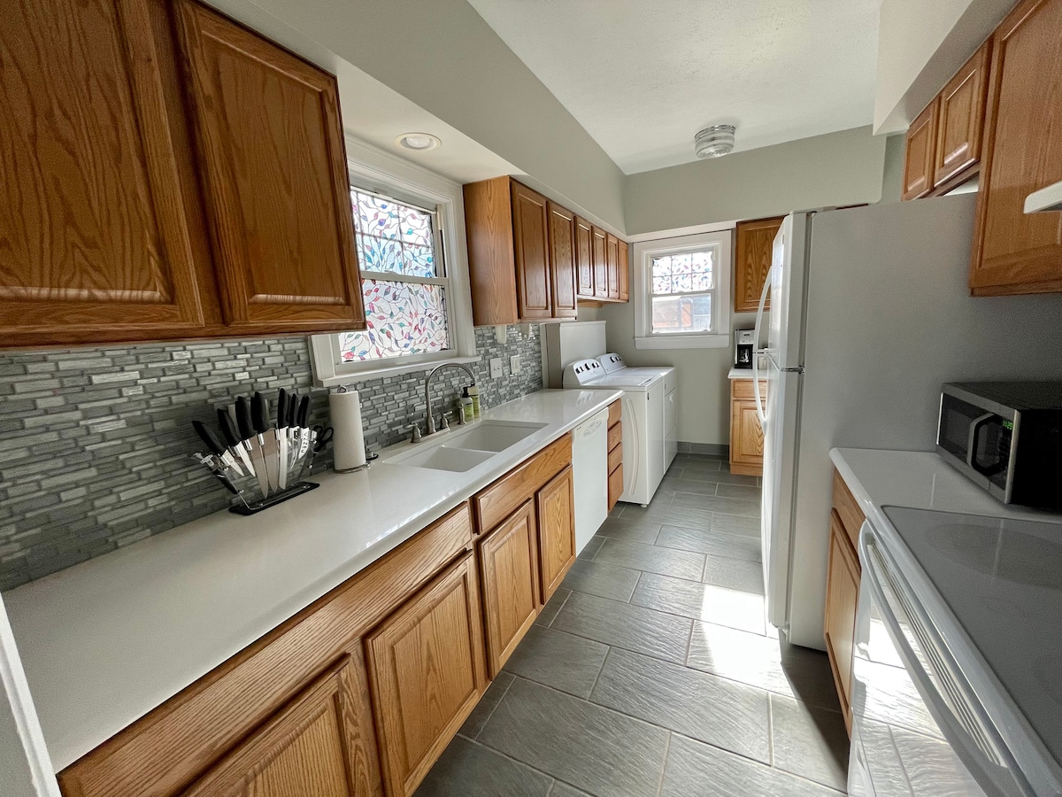 This beautiful 3 bedroom, 1.5 bathroom home has been fully remodeled with guest comfort in mind. Located on a quiet end-of-the-road street and corner lot. A grocery store, Starbucks, and other shops & eateries are a short walk away. To the south, you’ll experience open space, beautiful sunsets and enjoy the fresh Kansas air. Large bay windows light up the living room where you’ll also find a workstation to stay productive and enjoy the scenery.