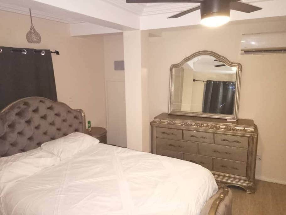 Enjoy a stylish experience at this serene and centrally-located place and 12 minutes drive from the airport. Each en suite bedroom is set in a beautiful aesthetic for your relaxation. It features a stylish & minimalistic living & dining area & fully equipped with all the modern amenities you need to feel at home; high-speed Wi-Fi, flat-screen TVs with cable channels, air conditioning in every room, with a fully equipped & spacious kitchen with everything you need to prepare your favorite meals.