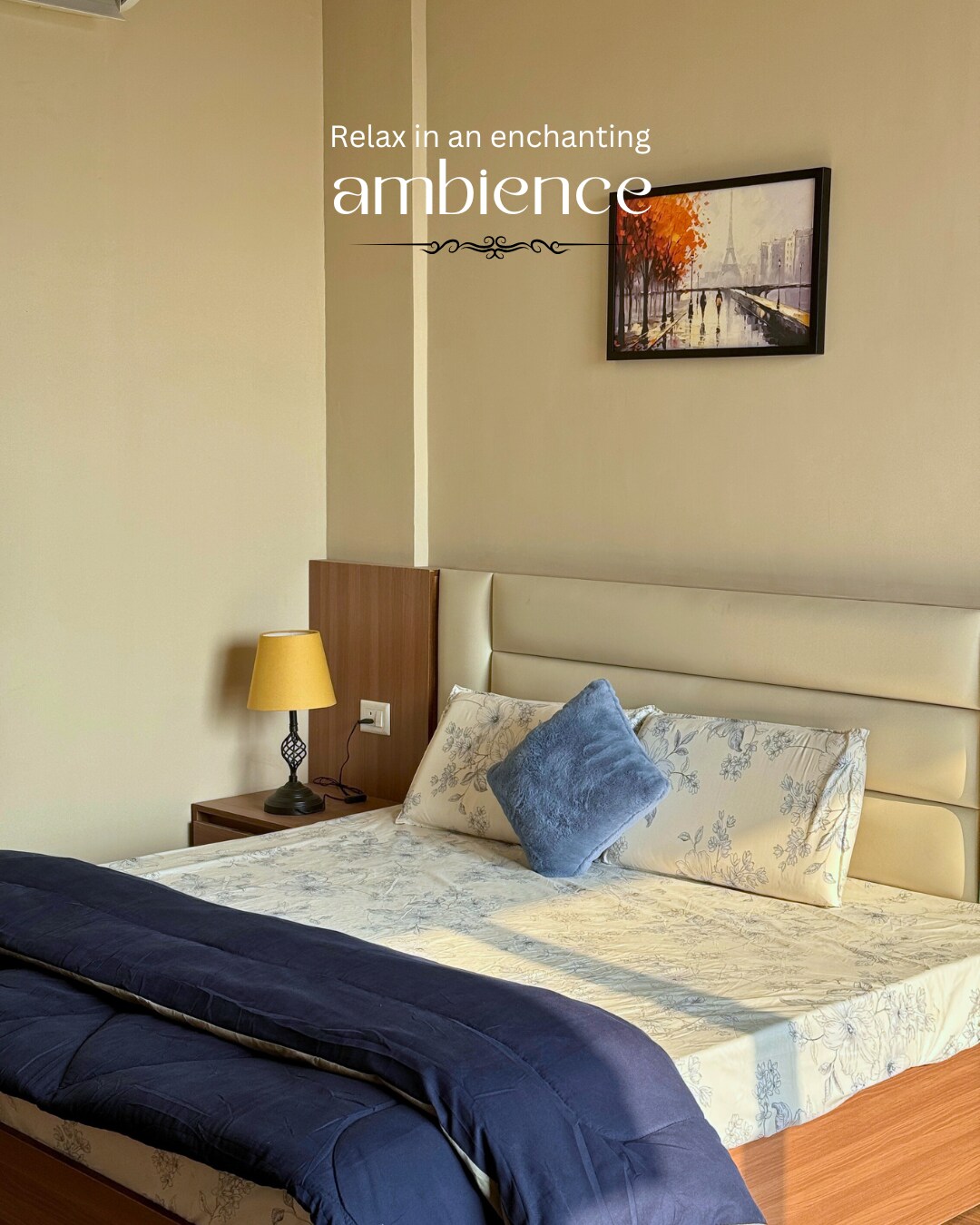 Kick back & relax in this calm & luxurious studio with the warmth of home & the vibe of a high-end hotel. Furnished with a plush Queen-size bed & modern décor. Amenities: 24/7 Grocery Store Modern Kitchenette High-Speed WiFi & TV Secure Parking outside tower but 24/7 Secured The first 2 floors has commercial shops, offering: Laundry Services Salon Café Medical Store Easy access to the India Expo Mart, Buddh International Circuit. Perfect for couples, solo travellers, or business partners.