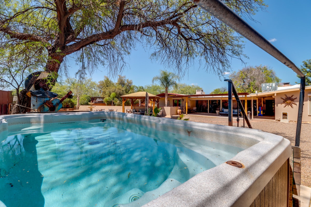 Main House, Guest House + 3 Casitas | Steps to Tanque Verde Creek Trail | Hot Tub & Swim Spa Make your next family reunion a hit when you stay at this amenity-packed vacation rental! This Tucson estate allows you and your crew plenty of privacy and outdoor living spaces to unwind. Relish the stunning landscapes of the Sonoran Desert when you hike Sabino Canyon, or stay home and grill up a family feast in the outdoor kitchen. ‘Horse Thief Ranch’ is the perfect launching point for your retreat!