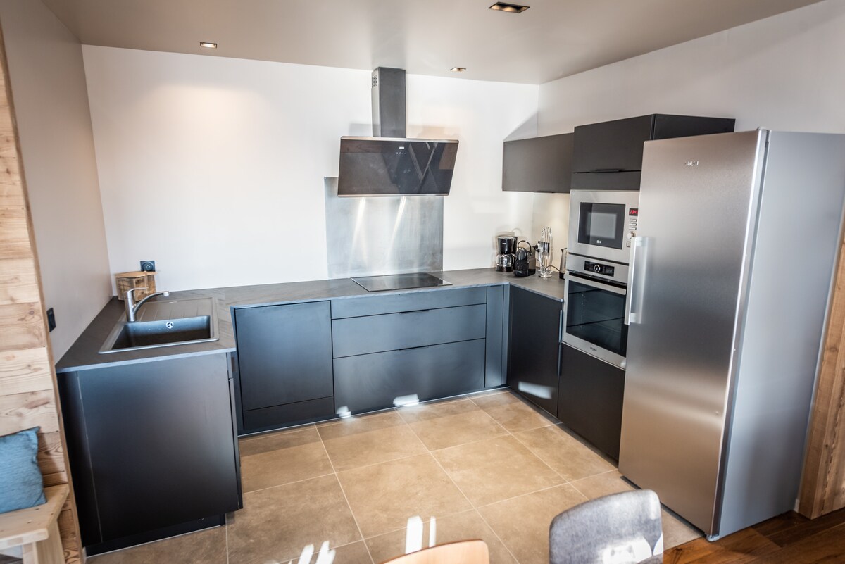 A breathtaking panoramic view of the mountains from the balcony, a living room made entirely of wood, high ceilings, an atmosphere that invites you to relax... The balcony opens onto sloping land bordered by a stream, discreet depending on the season with the discreet charm of the clarines in the background. Total immersion in nature. Intimate room, parking, easy access all season, equipment room. Sheets, towels, TV, fiber internet. Self check-in. Great for a duo in serenity!