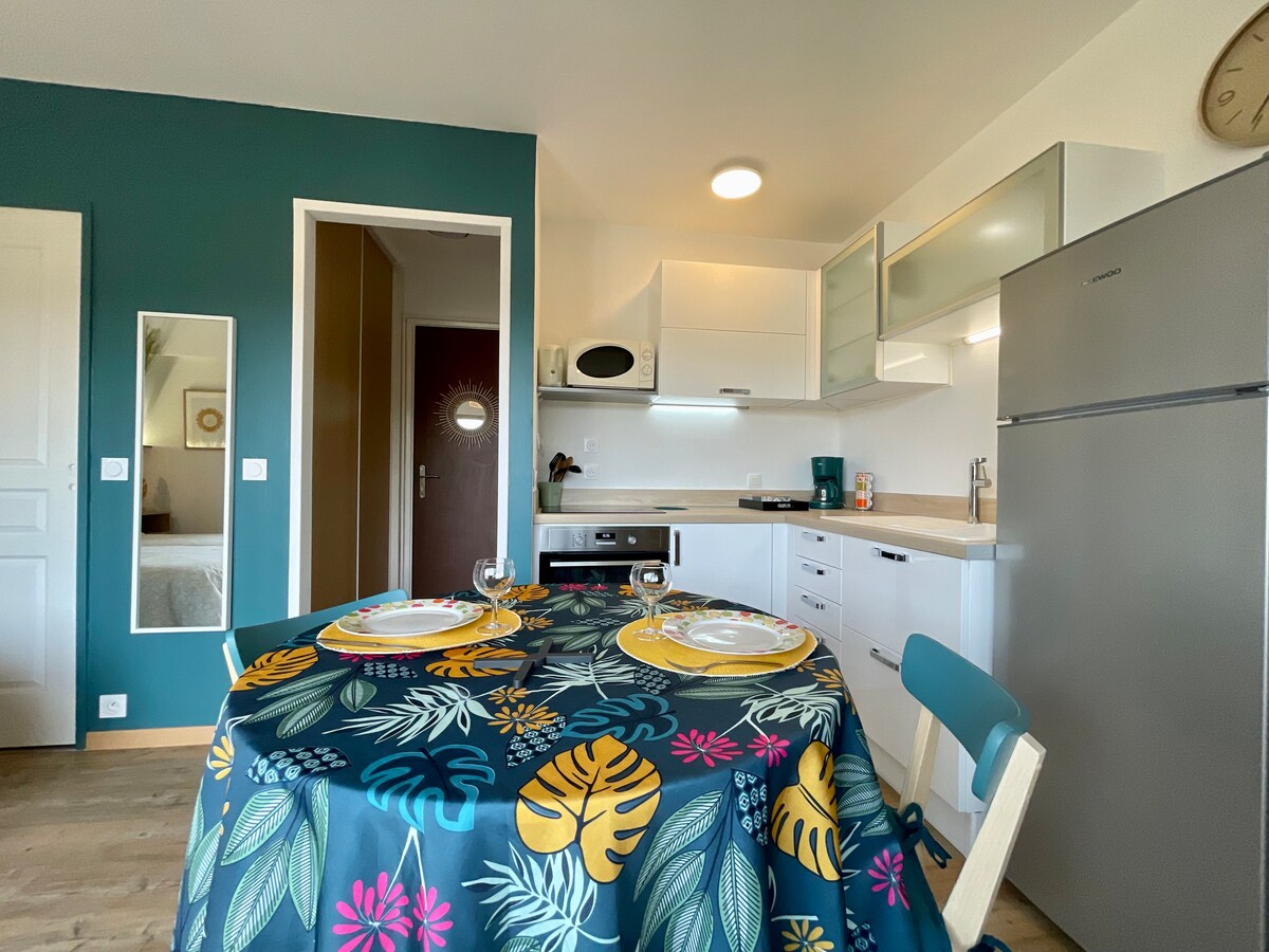 Please read the entire listing: linen not provided 17 m2 studio equipped for 2 people, 3rd floor, west facing, terrace overlooking park, double glazed sliding bay window, blackout curtain, awning. Bedroom area with 140 cm bedding – flat screen LED TNT TV – wardrobe – Fully equipped kitchen – Bathroom with shower, vanity unit – hair dryer – toilet – ironing board and iron Secure residence (digicode) Parking, Wi-Fi Bicycle storage