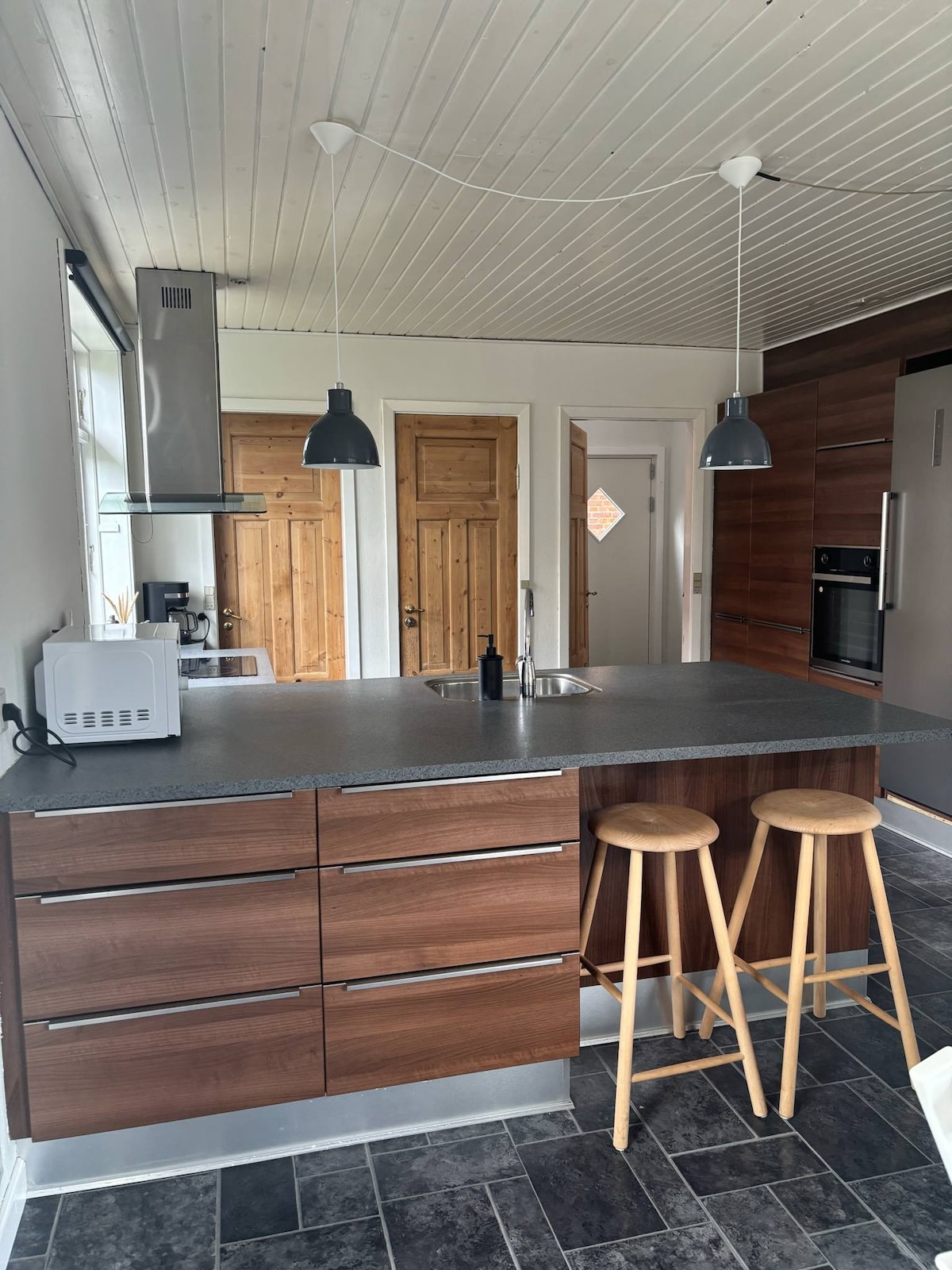 Newly established large room in separate building on farm property. Private entrance. The home consists of a living room/kitchen, bedroom and bathroom. A total of 30 m2. Everything in bright and friendly materials. There is a refrigerator, oven/microwave and induction stove. The home is equipped with all necessary kitchenware, glasses and cutlery. Chromecast is available for rent.
