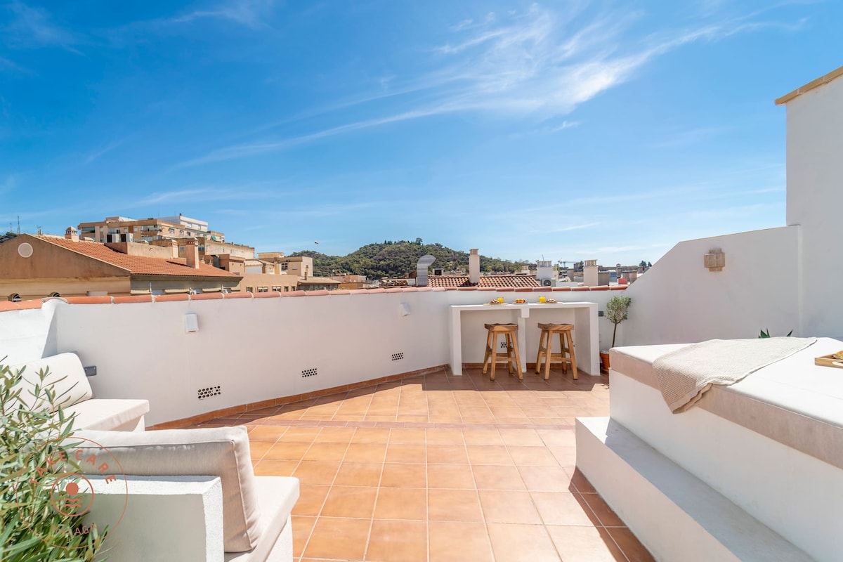 This Suite features a breath-taking view over the Mediterranean Sea from each room and terrace. You may enjoy watching the Sunrise over the water. It is South facing, bright and cosy. It has been recently refurbished. The space includes a large day area (living, dining and open plan kitchen), 1 bedroom, 1 bathroom (shower cabin & bidet) and private terrace with dining table for 4 and 2 lounge chairs. The kitchen is fully equipped. The living room has a sofa-bed (140x200cm). Ideal for a couple.