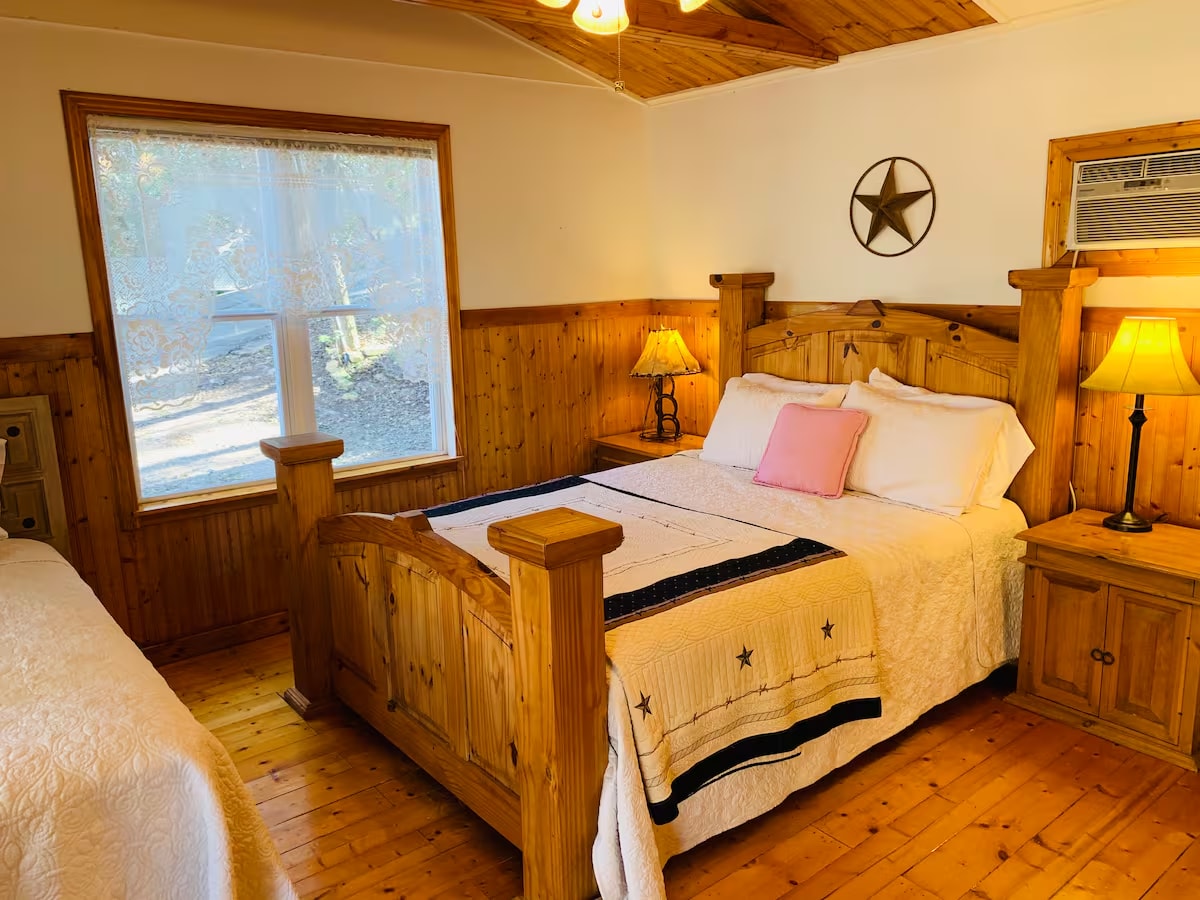 Primitive Cabin at Fernweh Riverfront on the Guadalupe River, Amarillo is one of three cabins located on the property with private river access. Appointed with 1 queen bed & 1 full bed, your sleep should be comfortable in the fresh new linens and soft pillows. A communal restroom and showers are a short walk away and shared by the three primitive cabins. Parking Available = 1 Spot.